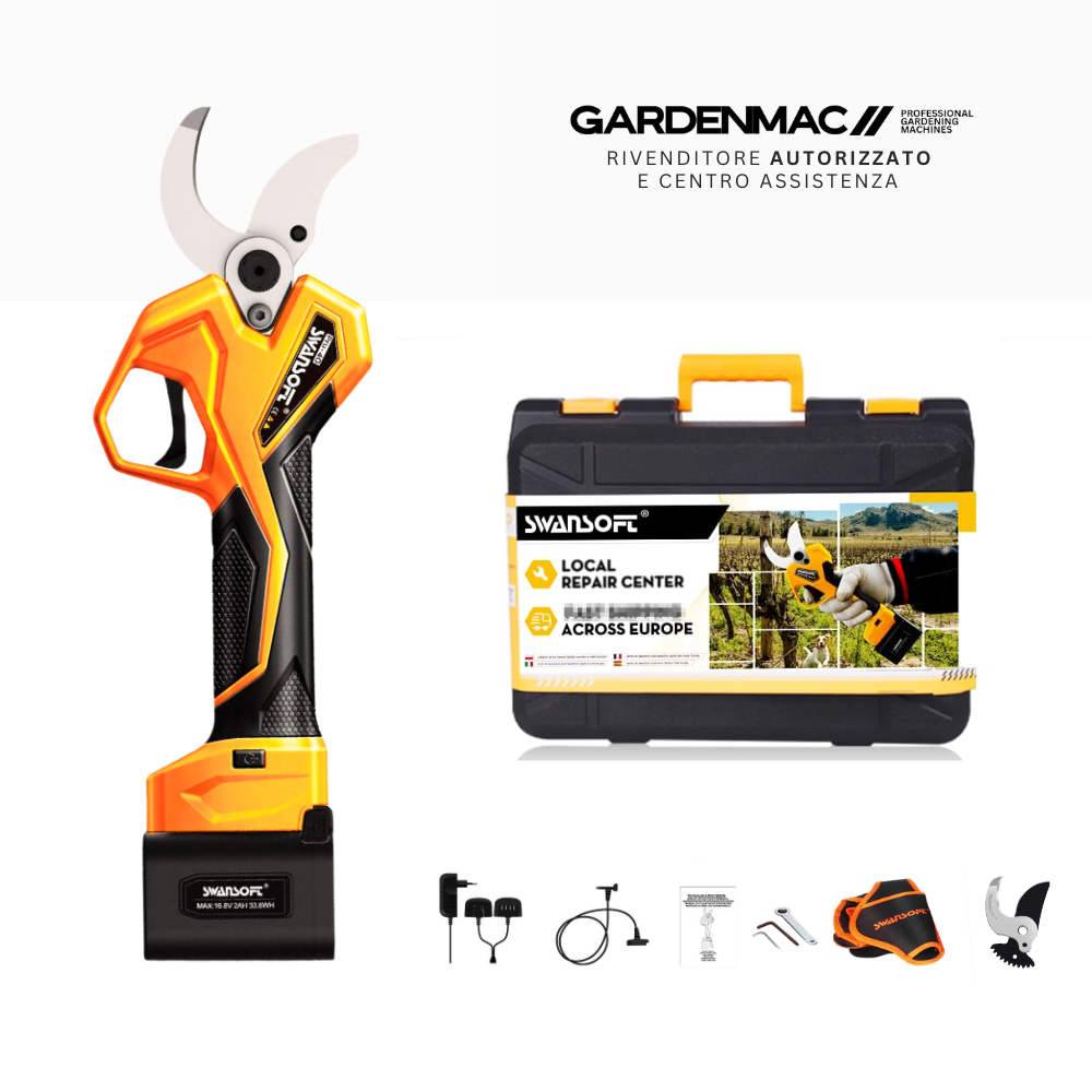 Con la Pru-36 hai la doppia compatibilità: puoi montare la stessa asta dei nostri potatori. Ed inoltre puoi intercambiare le batterie con i potatori da 16.6V : Swansoft CS-0, CS-1 e M-CUT 6.