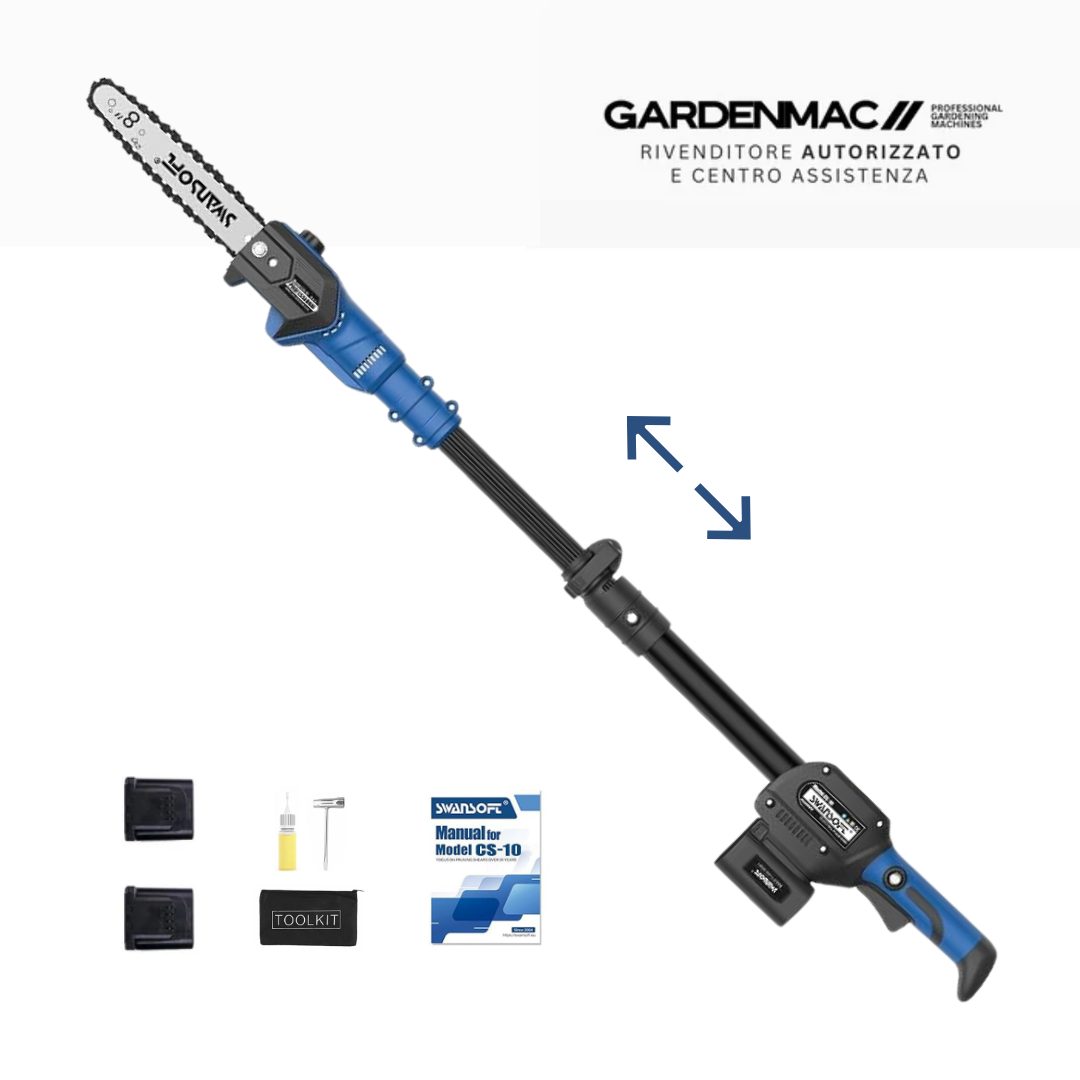 Regola in base alla tua esigenza l'asta telescopica, da 1.7 a 2.6mt per arrivare a cime fino a 4.5mt.